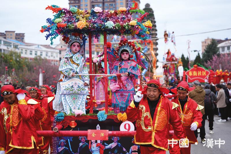 上午9时30分,社火游演拉开帷幕。舞龙、舞狮、采莲船、踩高跷依次而来,百人锣鼓方队、秧歌队穿插其中。随后,本次活动的重头戏,国家级非物质文化遗产——洋县悬台社火惊艳亮相。大破天门阵、龙凤呈祥、大赐福等经典悬台社火剧目依次亮相,引得现场群众掌声不断、叫好连连。洋县悬台社火以“高、险、奇、巧”为特色,融戏剧、杂技、造型艺术于一体,演员悬于高台之上,造型精巧、气势恢宏,尽显传统民俗的独特魅力。