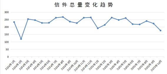 10月,“市长信箱”共收到群众来信176件。信件总量变化趋势如下图所示: