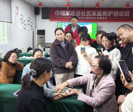 在巾帼家政进社区家庭照护培训班上,老师为学员们讲解、演示量血压的规范操作。