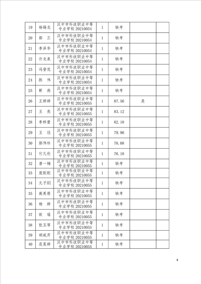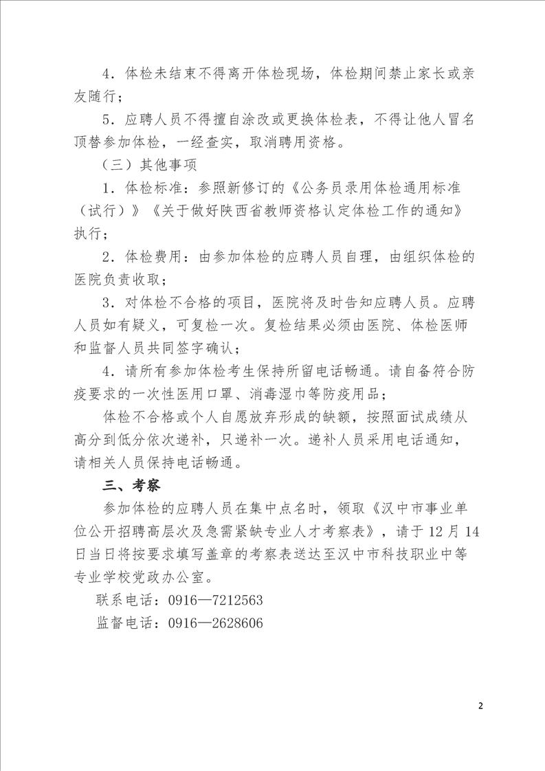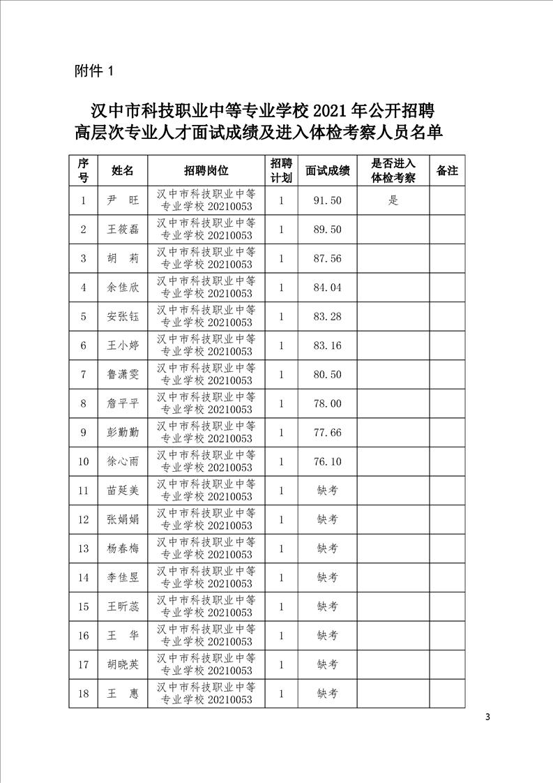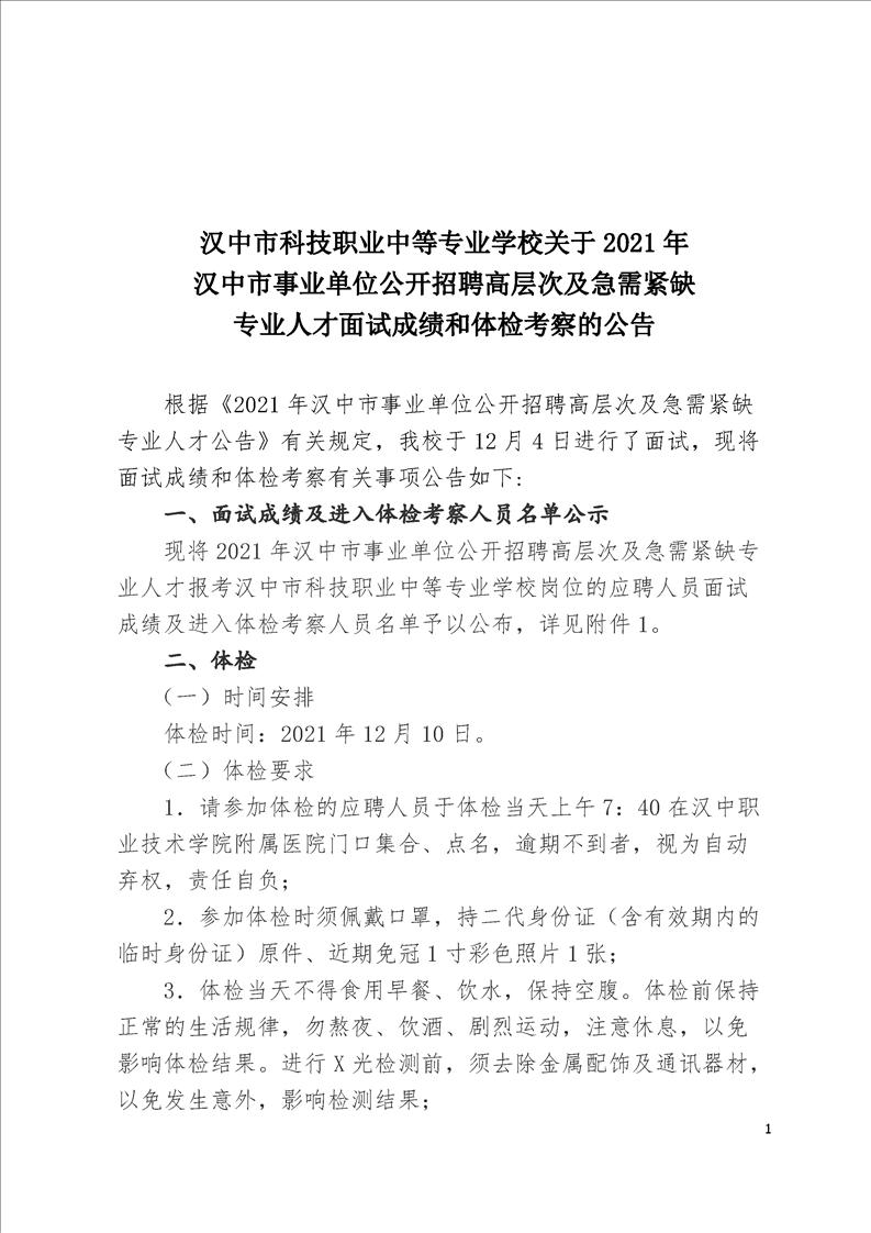 汉中市科技职业中等专业学校关于2021年汉中市事业单位公开招聘高层次及急需紧缺专业人才面试成绩和体检考察的公告