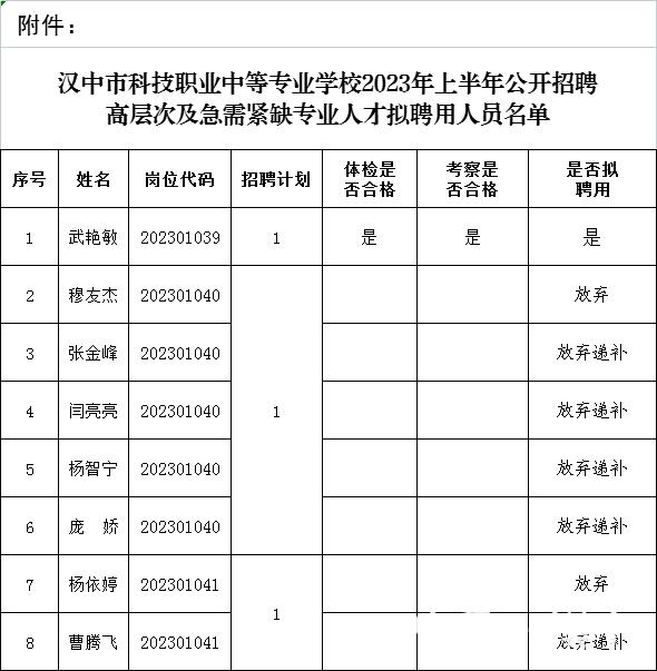 附件:汉中市科技职业中等专业学校2023年上半年公开招聘高层次及急需紧缺专业人才拟聘用人员名单