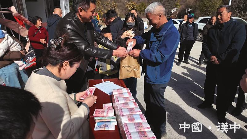 这是蔡家坡村民第3年从“能人”彭刚创办的企业领取务工工资,加上土地流转租金、村集体分红等,大家领到手里的“红票票”厚厚一沓。从2024年首次发放分红至今,记者已是第3年见证这个秦岭深处小山村的喜悦与变迁。