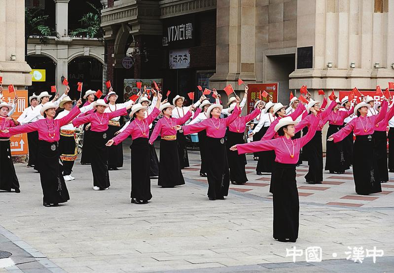 汉中市椰岛锅庄舞队在排练庆国庆节目。 记者刘俊强摄