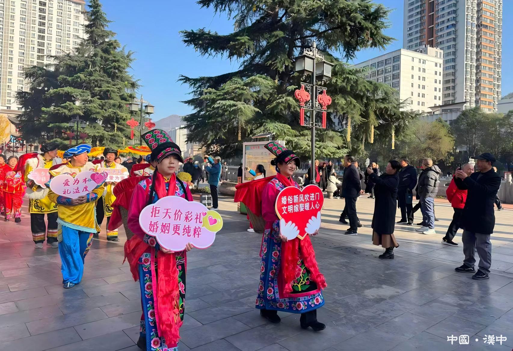 上午10时,婚礼序幕正式拉开,新郎新娘们在喧天锣鼓和缤纷彩旗的簇拥下,手牵绣球,踏着欢快的节拍沿着略阳主城区街道巡游。队伍一路向围观群众“撒福包”,传递新婚喜悦的同时,主动宣扬文明婚俗的理念,引得市民游客驻足喝彩,纷纷送上祝福。