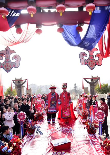 1月17日,宁强县林子轩、窦雅洁夫妇在县羌族文化博览园举行传统羌族婚礼,以庄重而喜庆的形式践行和弘扬羌族婚俗文化。