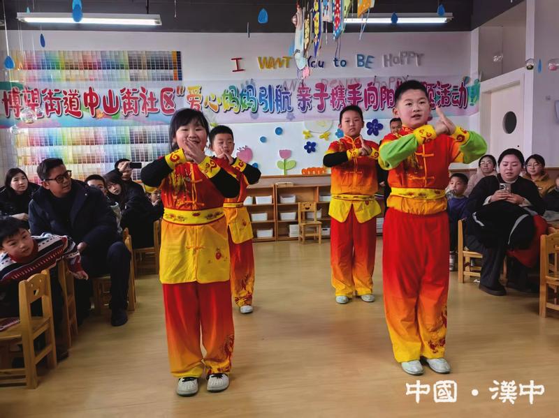 中山街社区“爱心妈妈引航亲子携手向阳”主题活动上,孩子们展示武术表演。