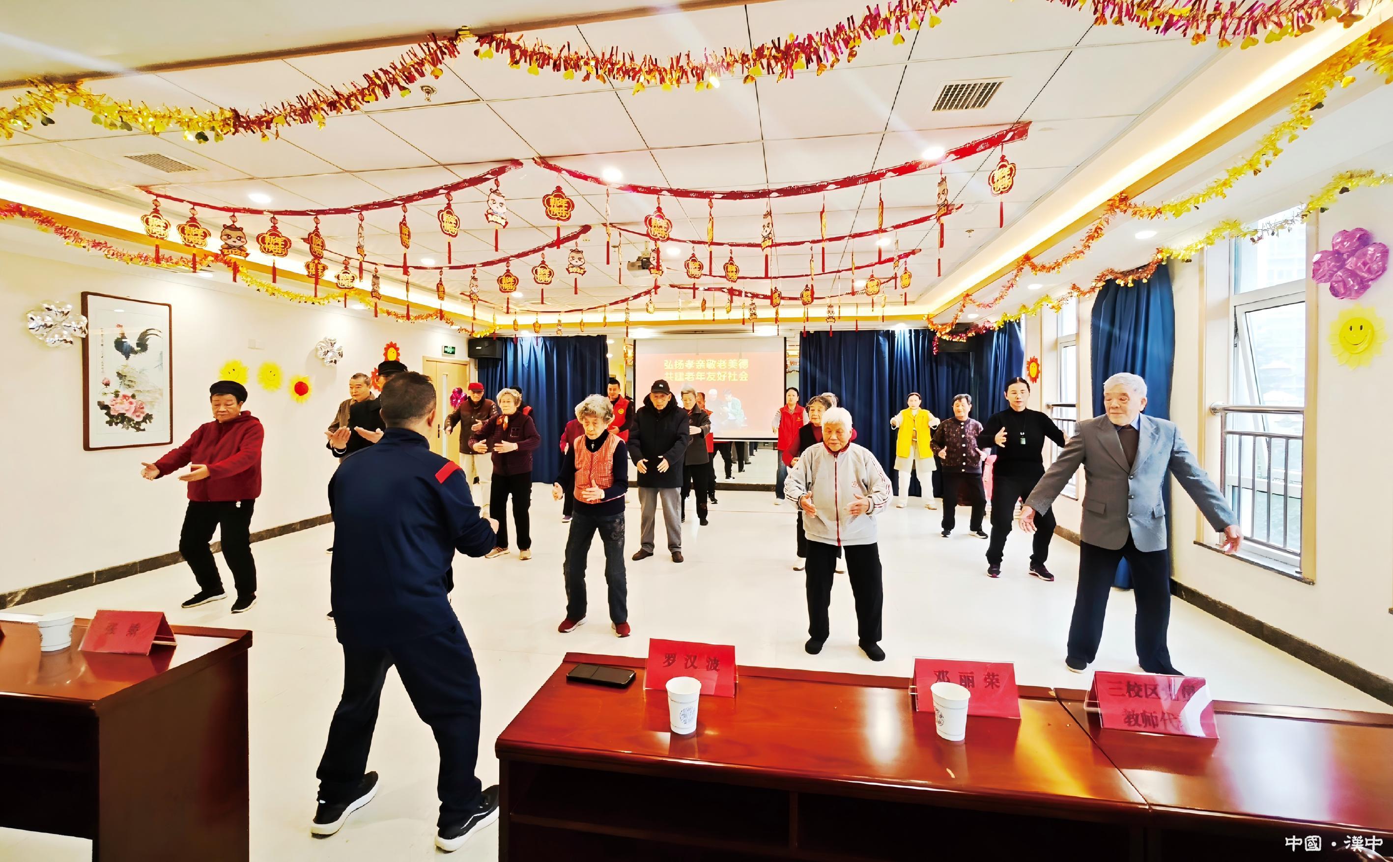 在汉台区褒国康乐园养老社区,老人们伴着音乐练习八段锦,整个场面洋溢着健康向上的活力。 受访者供图
