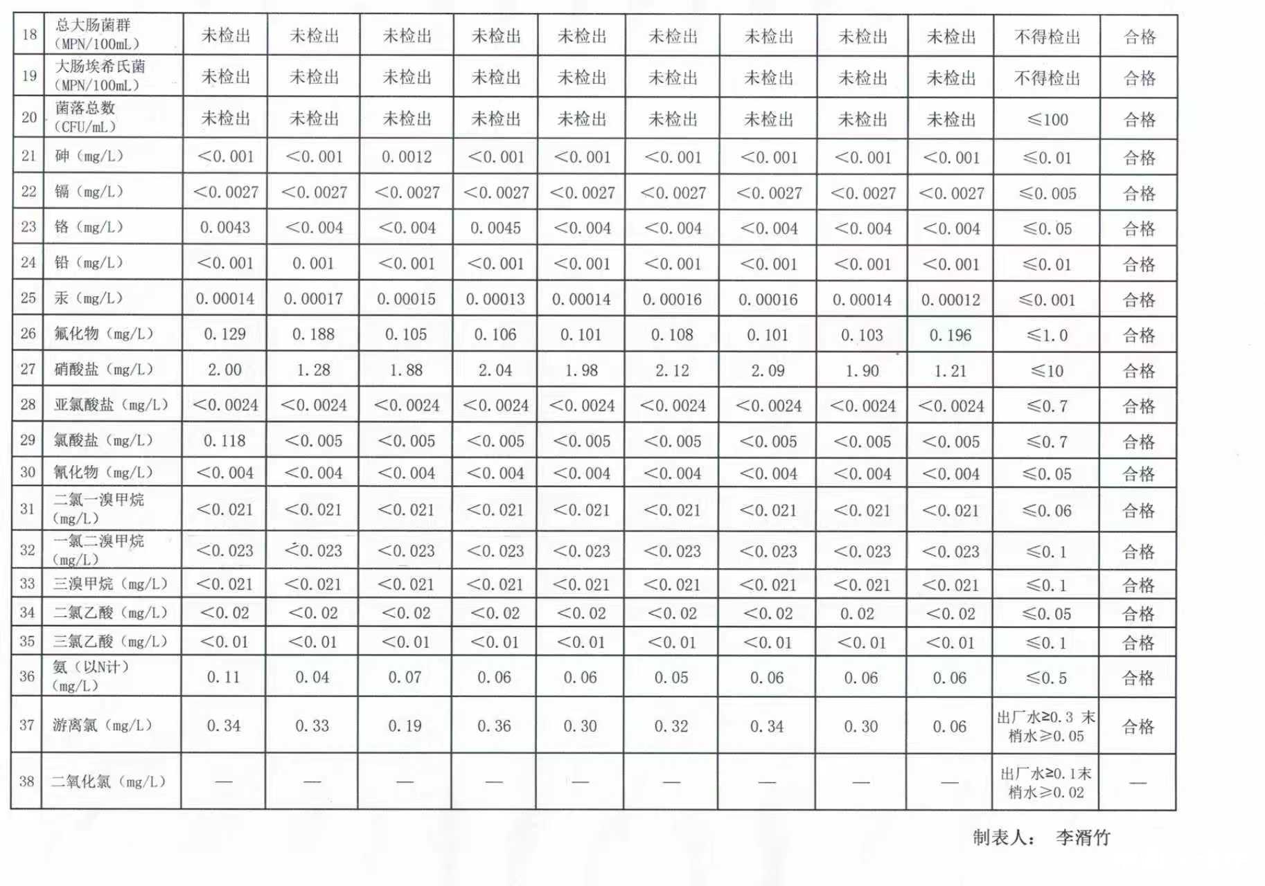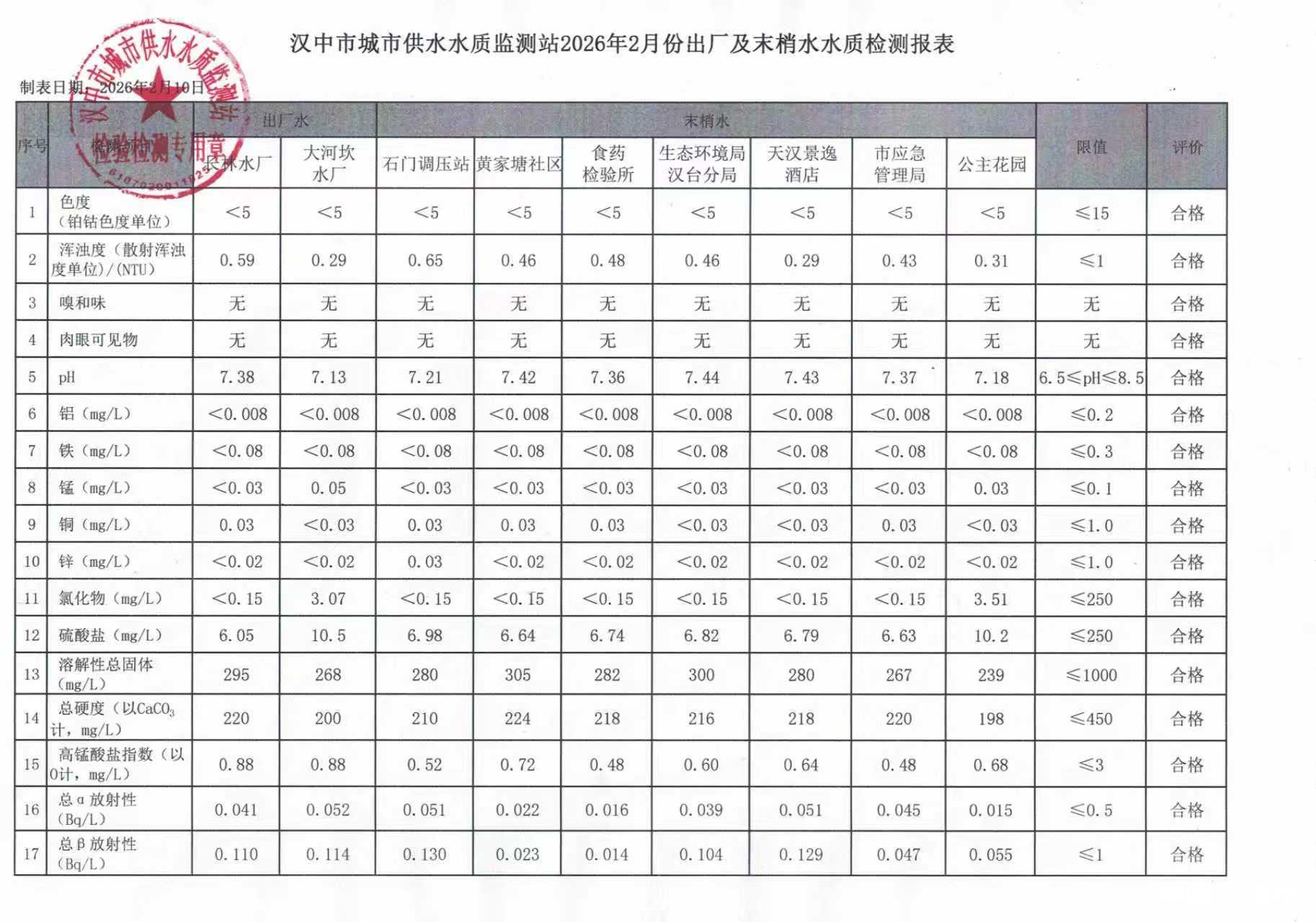 汉中市城市供水水质监测站2026年2月份出厂及末梢水水质检测报表