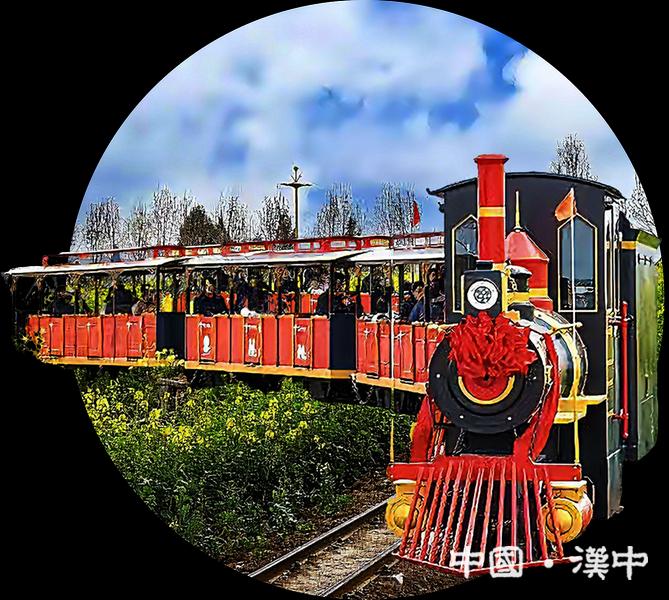 游客坐在汉台区皇塘村观光小火车上赏花。