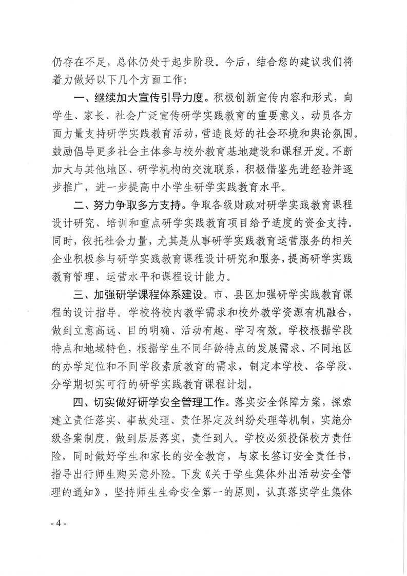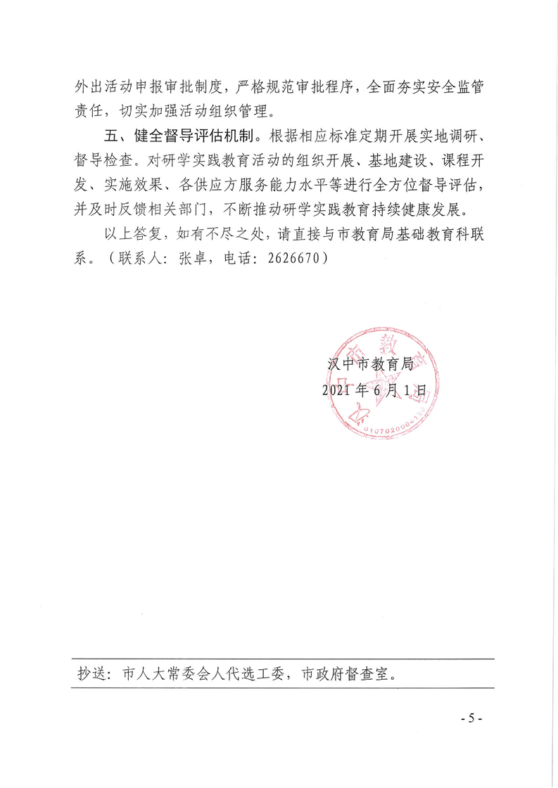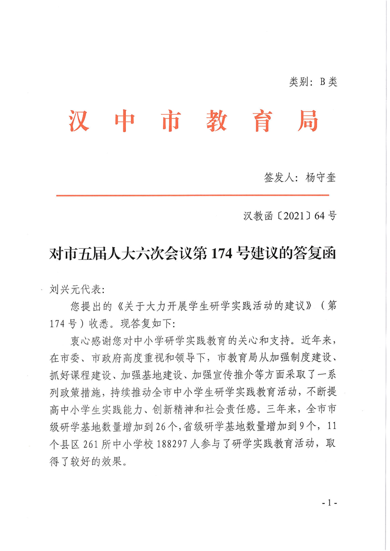 汉中市教育局对市五届人大六次会议第174号建议的答复函