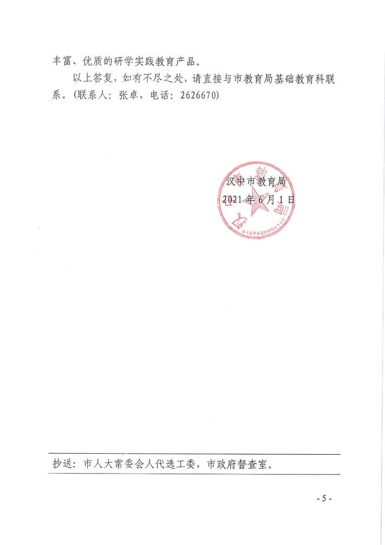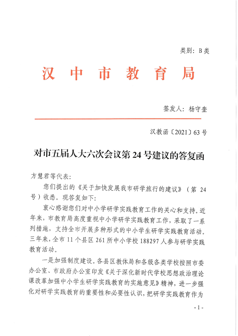 汉中市教育局对市五届人大六次会议第24号建议的答复函