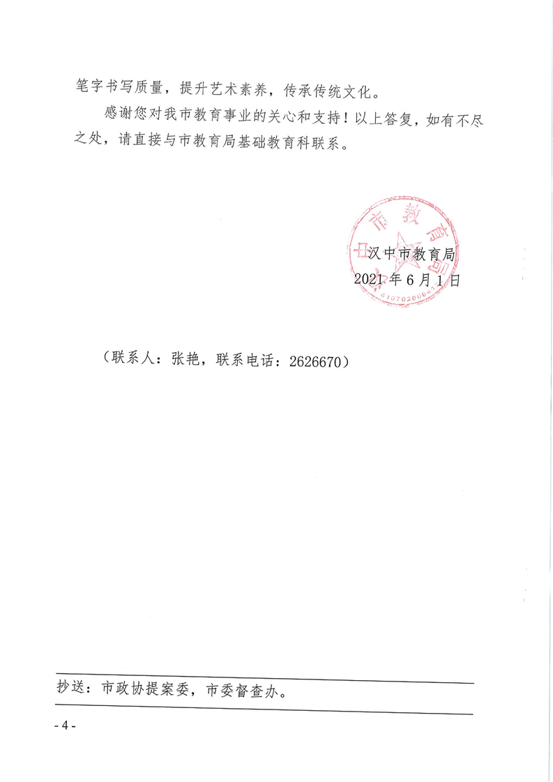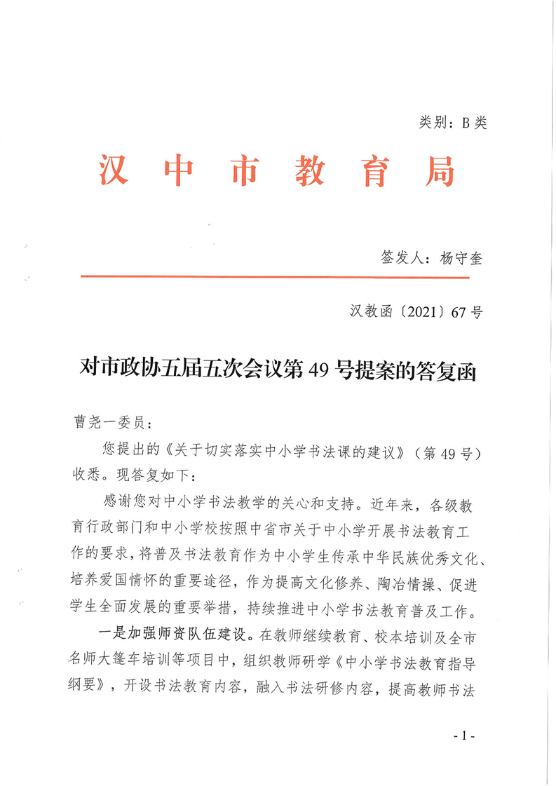 汉中市教育局关于对市政协五届五次会议第49号提案的答复函