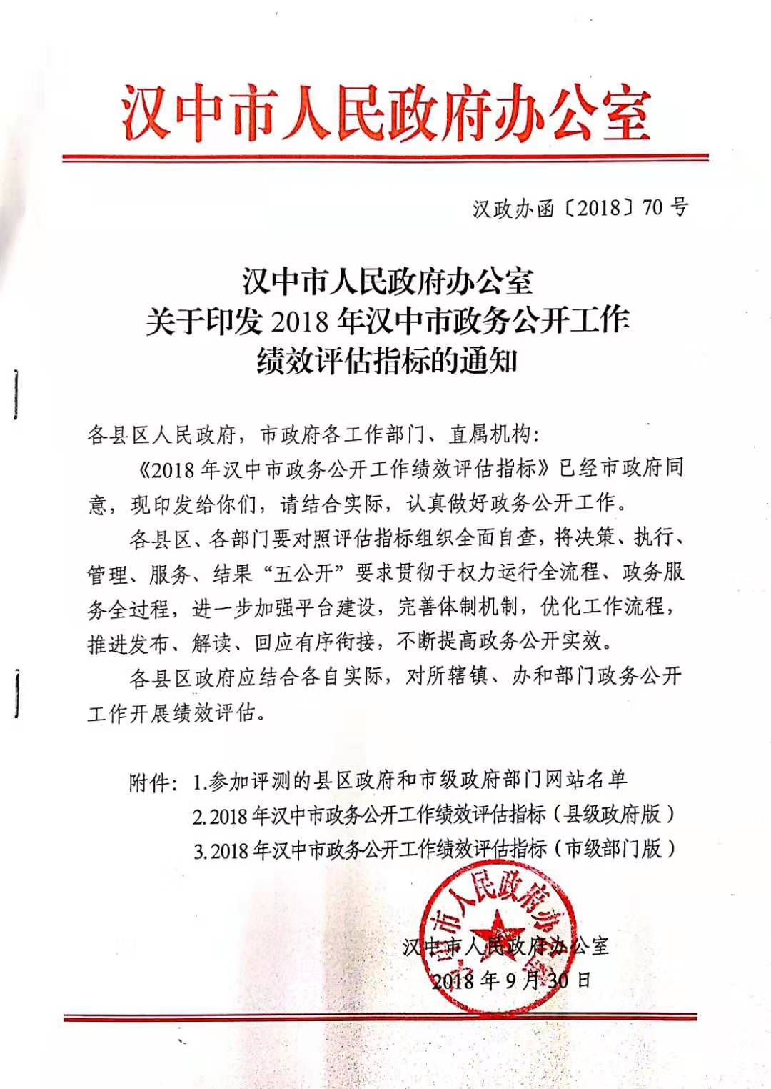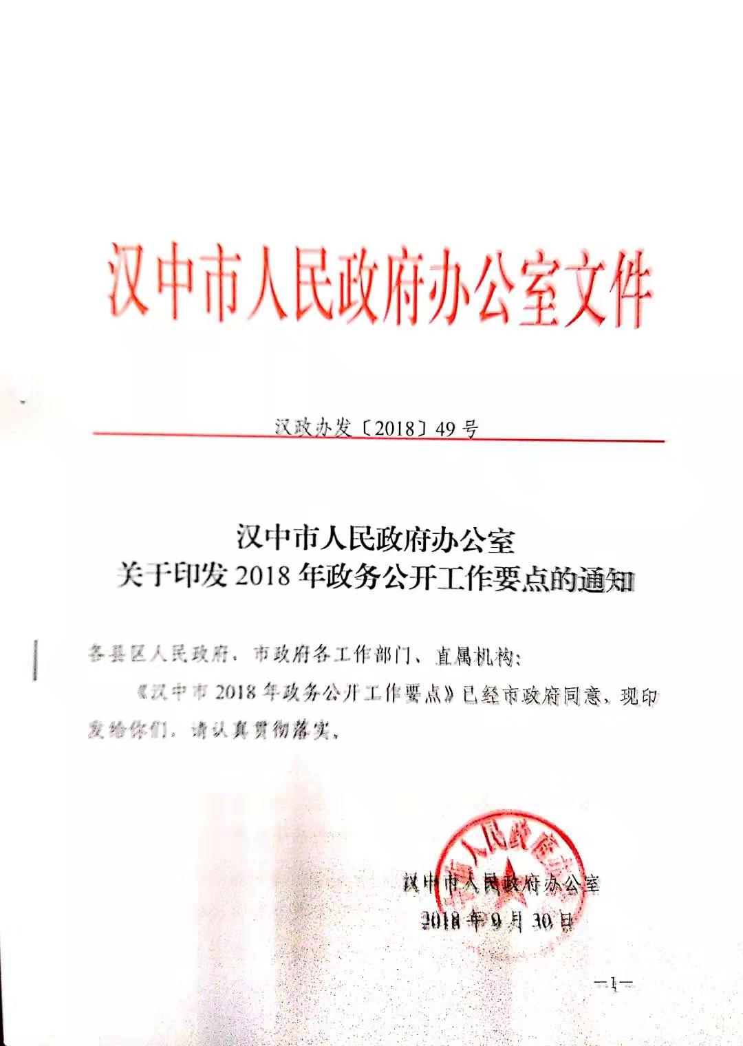 2018年,我市以《国务院办公厅关于印发2018年政务公开工作要点的通知》(国办发〔2018〕23号)和《陕西省人民政府办公厅关于印发2018年政务公开工作绩效评估指标的通知》(陕政办发〔2018〕46号)为指引,制订出台《汉中市人民政府办公室关于印发2018年政务公开工作要点的通知》(汉政办发〔2018〕49号)和《汉中市人民政府办公室关于印发2018年汉中市政务公开工作绩效评估指标的通知》(汉政办函〔2018〕70号),紧抓目标任务考核,着力提升政府信息公开规范化、制度化水平,不断提升公开透明度,提高群众满意度。