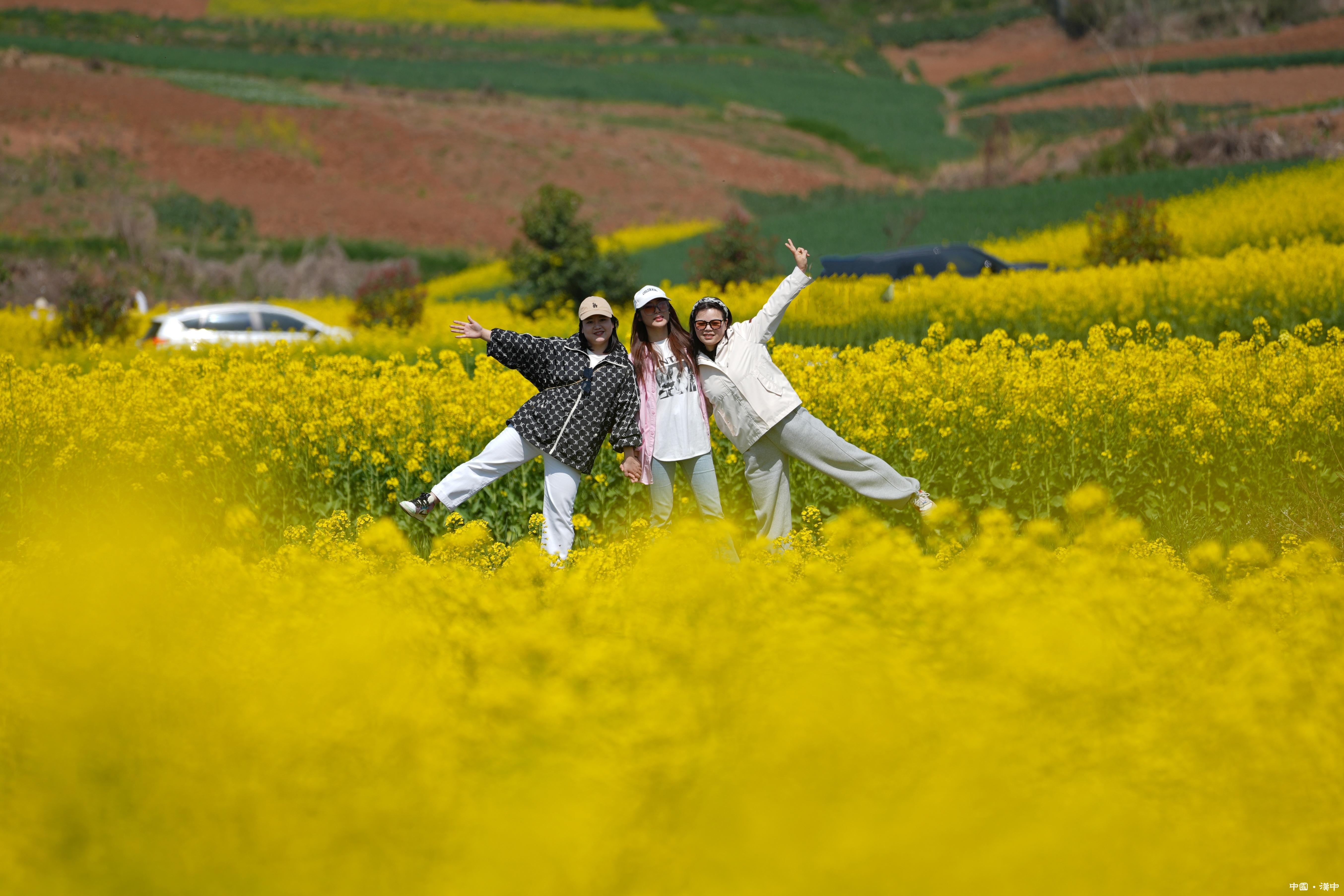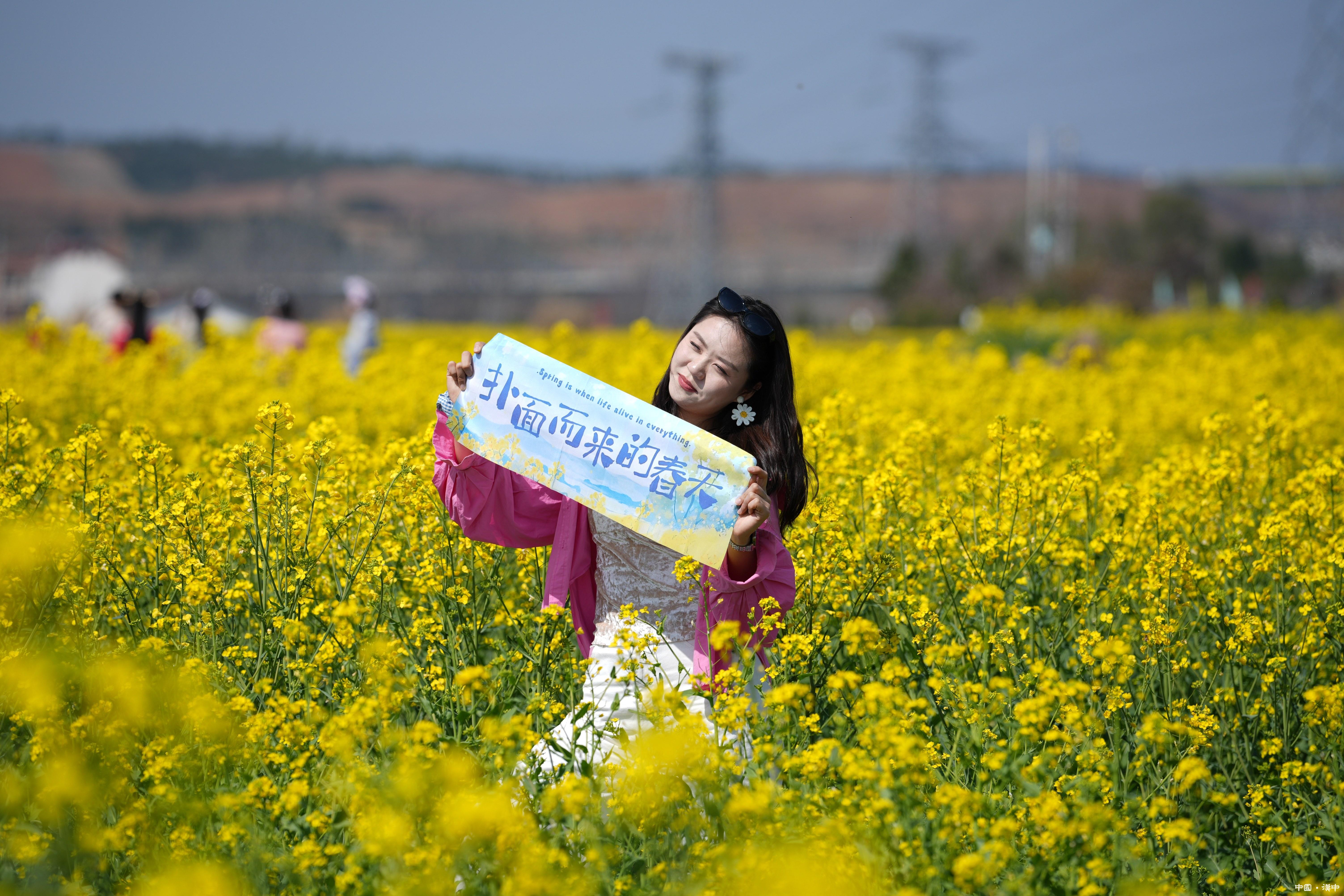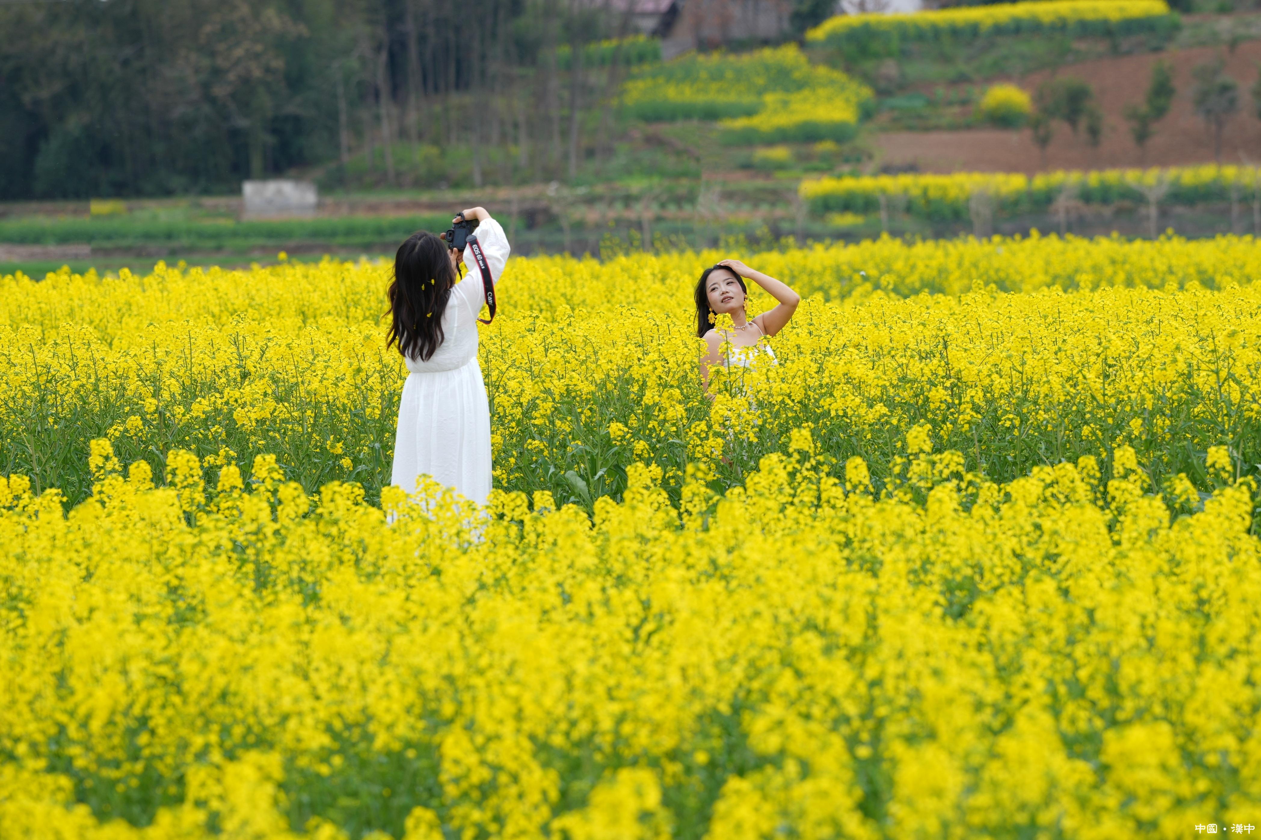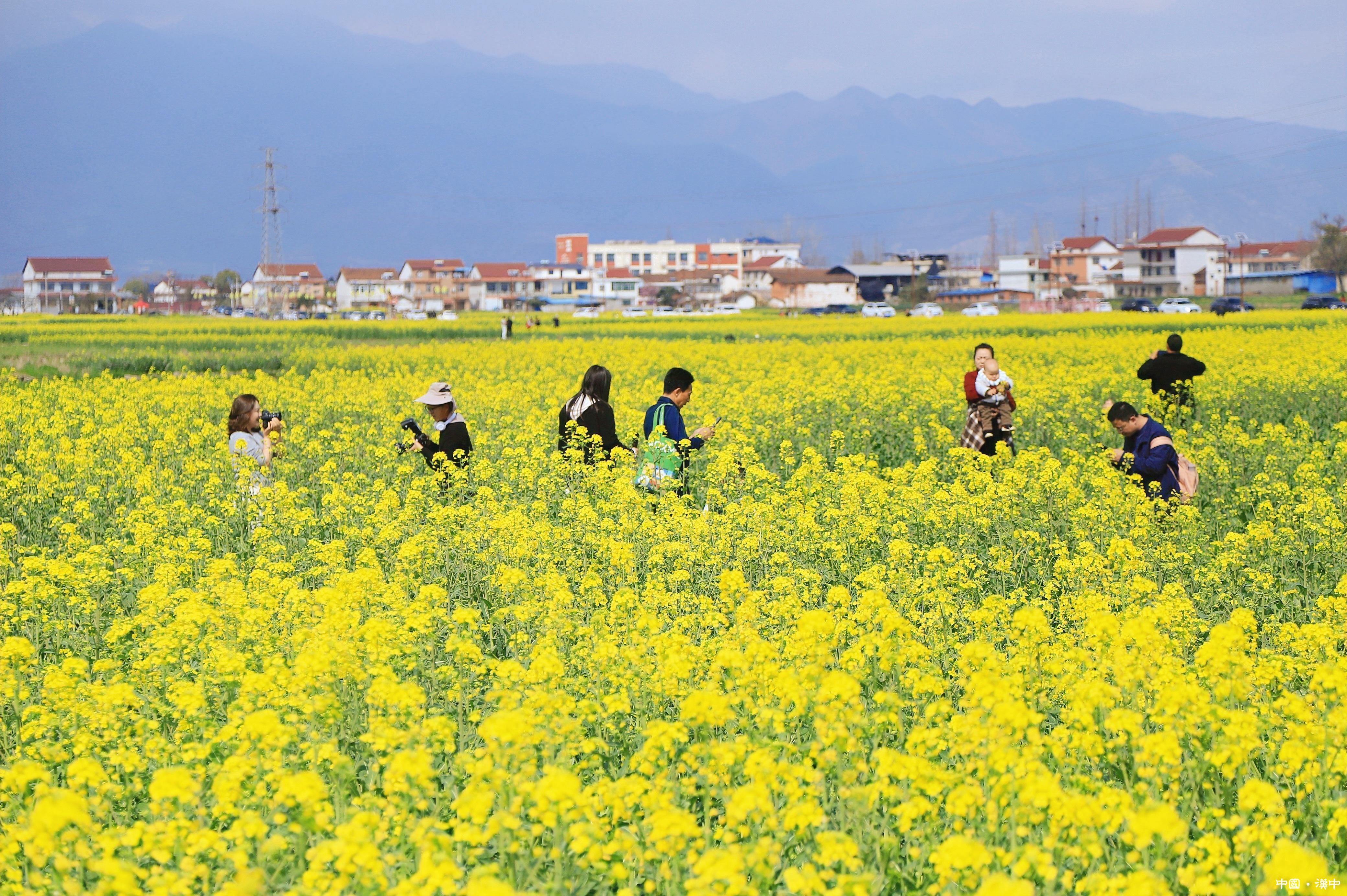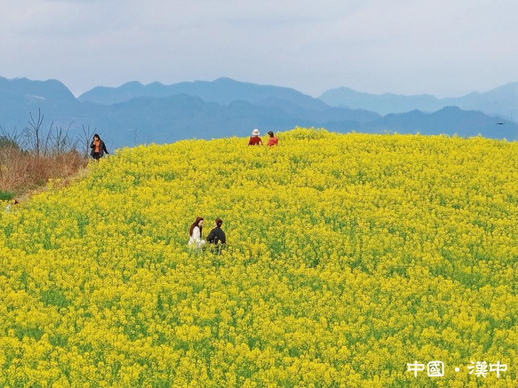 春意盎然,天汉大地铺展成一片花的海洋,连绵起伏的田野被灿烂的油菜花染成金色,与远处青山相映成趣,构成一幅生机勃勃的田园画卷。游客们纷纷走进花海,或驻足拍照,或嬉戏留影,尽情享受大自然馈赠的视觉盛宴。