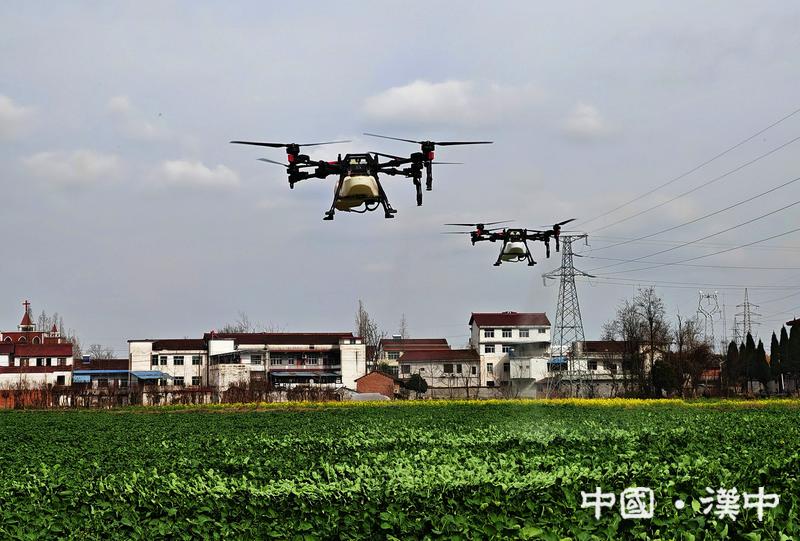近日,南郑区工作人员操作植保无人机,对油菜进行“一喷多促”作业。