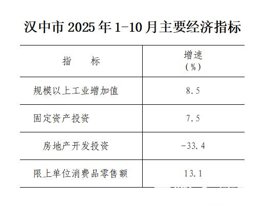 汉中市2025年1-10月主要经济指标