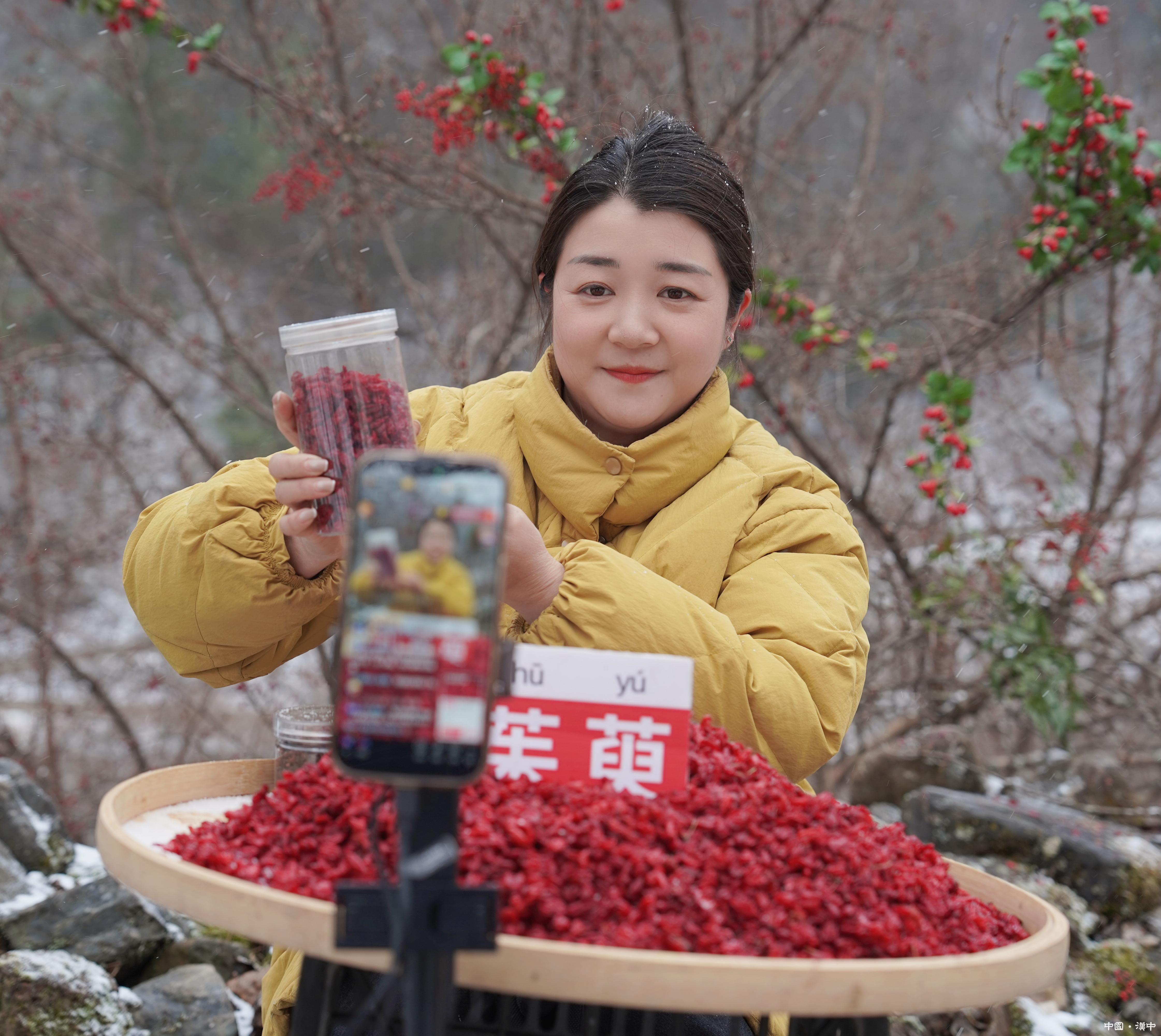 1月28日,漫天大雪覆盖群山,在佛坪县长角坝镇龙草坪村东河台的山茱萸林里,“秦岭寻美”账号的本土主播王雯在做跨年度的第四场直播。“家人们看过来,这就是咱们佛坪县的山茱萸,果实饱满、肉质厚实、天然原生态,泡水泡酒都绝佳!”镜头扫过挂满枝头的“红玛瑙”,也记录下农户们采摘分拣的忙碌身影。